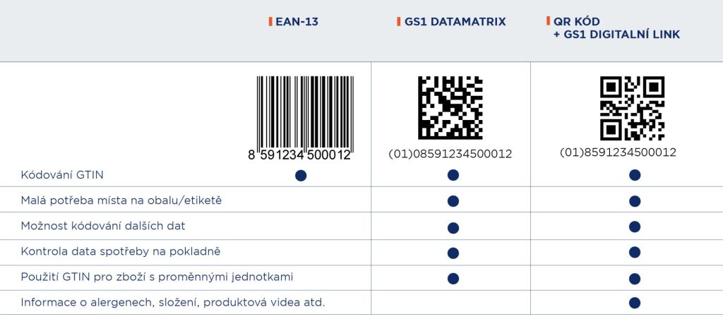 1D kódy EAN kódují pouze identifikátor produktu GTIN. 2D kódy zaberou méně místa na obalu, zato dokáží zakódovat více. Mohou obsahovat další údaje, jako je datum exspirace, číslo šarže, sériové číslo a další. Pomocí GS1 Digitálního linku v QR kódu nebo kódu GS1 DataMatrix mohou výrobci propojit své produkty s webem a zpřístupnit libovolné množství informací a on-line obsahu. Pro spotřebitele např. informace o alergenech, recepty, videa. A pro obchodníky certifikáty, informace o svolávacích akcích a mnoho dalšího.