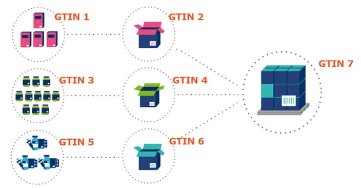 V okamžiku, kdy ale dodáváme paletu heterogenní (mixovanou), tzn. paleta obsahuje více různých výrobků (na obrázku GTIN 1, GTIN 3 a GTIN 5)v různých kartonech (GTIN 2, GTIN 4 a GTIN 6), přiřazení GTIN u této palety je povinné (GTIN 7). Není však nutné tento GTIN (resp. čárový kód, který daný GTIN kóduje) tisknout a umísťovat na paletu, pokud to obchodní partneři nevyžadují. GTIN může sloužit pouze pro účely elektronické komunikace ať už v GDSN, nebo v jiných systémech.