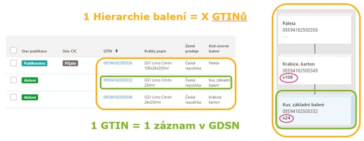 Ve standardech GS1 rozlišujeme tři úrovně balení: spotřebitelské, obchodní a logistické jednotky. Typickým příkladem je produkt (kus) zabalený v kartonu, který je umístěn na paletě. Zatímco v běžné zalistovací kartě bývají informace o celé hierarchii balení pohromadě, v GDSN pro každou úroveň vytváříme samostatný záznam – samostatnou položku. Tyto položky se nakonec propojí, čímž se vytvoří hierarchie balení. Pro každou úroveň balení se vyplňují jiné údaje (atributy). Každá úroveň balení vložená do GDSN se povinně identifikuje pomocí vlastního GTIN. Jedinou výjimkou je homogenní, tedy jednodruhová paleta, která GTIN mít nemusí.