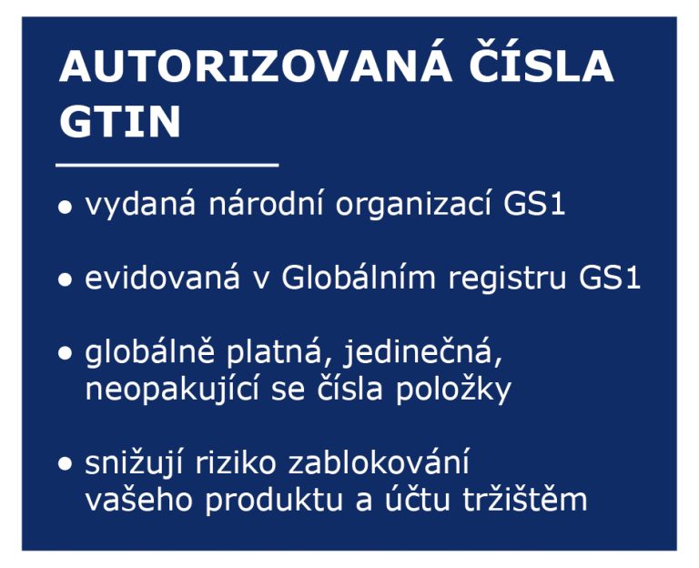 Pouze GTIN od autorizovaného poskytovatele je garancí bezproblémového zalistování zboží na on-line tržišti. Důrazně nedoporučujeme nákup těchto čísel od přeprodejců. Může se stát, že je marketplace zablokuje, protože není zaručena jejich jedinečnost (dané číslo mohlo být přiděleno jinému výrobku). Z tohoto důvodu si stále více tržišť ověřuje, zda jsou čísla GTIN uložena v Globálním registru GS1 – centralizované databázi identifikátorů GS1.