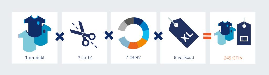 Jednoduchý příklad: Prodáváte tričko v sedmi různých variantách. Každý střih se vyrábí v sedmi barvách. Každé tričko je dostupné ve velikostech XS, S, M, L a XL. To znamená, že potřebujete 245 GTIN.