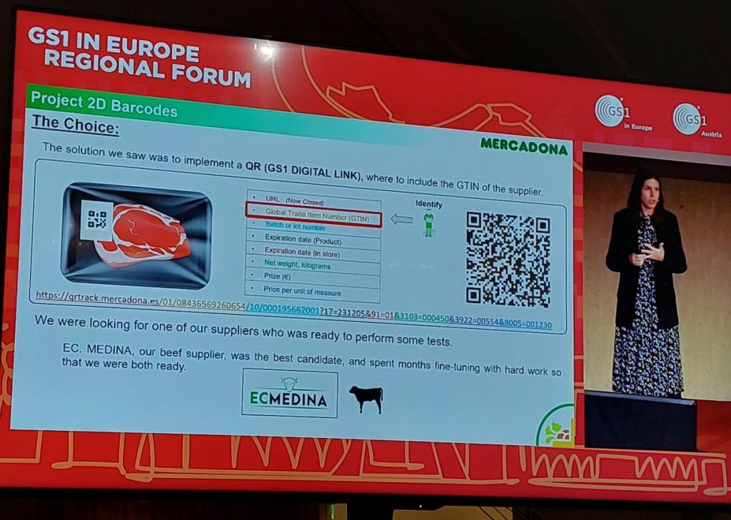 Následovala případová studie z aplikace QR kódů v oblasti čerstvých potravin. Španělská maloobchodní síť Mercadona ve spolupráci s dodavatelem produktů z hovězího masa E. C. Medina implementovala 2D kódy na nekalibrovaném (váženém) zboží. QR kódy slouží k identifikaci balíčků masa a je v nich zakódován GTIN, číslo šarže, datum exspirace produktu a datum, do kterého je možné produkt nabízet na prodejní ploše, dále čistá hmotnost, cena za položku a cena vztažená ke hmotnosti. Díky standardu GS1 Digital Link stejný kód zprostředkovává B2C data pro spotřebitele. Retailerovi přechod na 2D kódy pomohl vyřešit problémy spojené s využíváním čísel s omezenou působností RCN a také významně zvýšit účinnost řízení zásob. Díky efektivnímu systému automatického slevování u položek s blížícím se datem spotřeby se obchodníkovi podařilo minimalizovat plýtvání. Případová studie tak přiblížila praktické výhody nové generace kódů v maloobchodním sektoru, který se na migraci na 2D kódy připravuje nejen v Evropě.